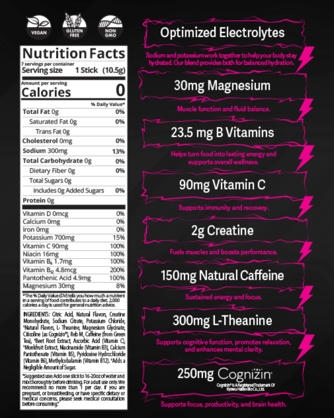Fueled by electrolytes, natural caffeine, L-Theanine, Cognizin, Creatine, and essential vitamins—no sugar crashes, just smooth focus and performance.
